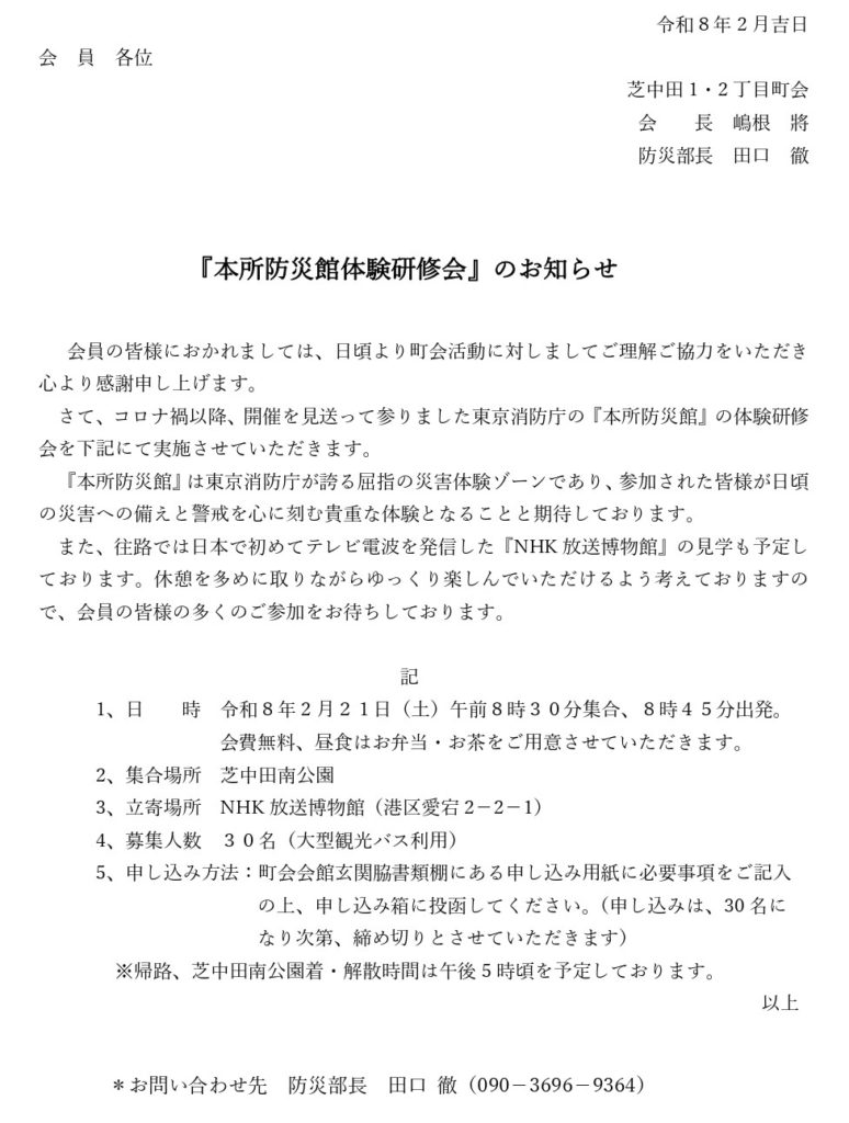 2026年2月1日 / 最終更新日時 : 2026年2月1日 shibanakada1-2 防災部 「町会防災研修会」参加申し込み中! 下記の通りです。 本所防災館 https://www.tfd.metro.tokyo.lg.jp/taiken/honjo/index.html