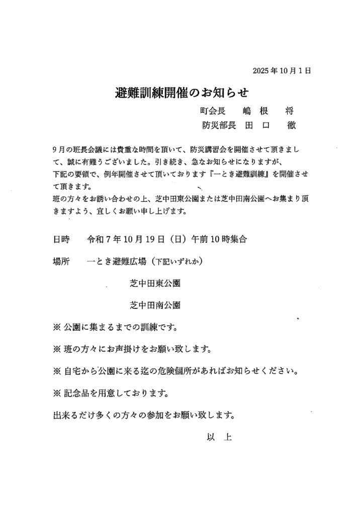 2025年10月2日 / 最終更新日時 : 2025年10月2日 shibanakada1-2 防災部 避難訓練のお知らせ 日時:2025年10月19日(日)午前10:00集合 場所:芝中田南公園または芝中田東公園