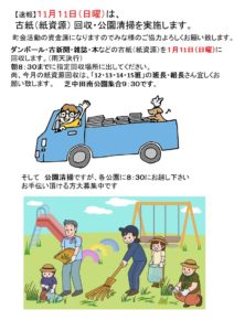 【速報】1月11日(日)は、 古紙(紙資源) 回収・公園清掃を実施します。