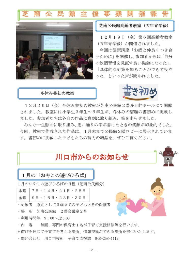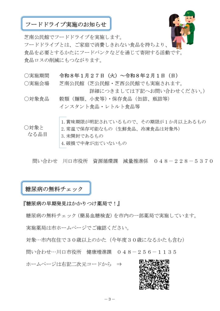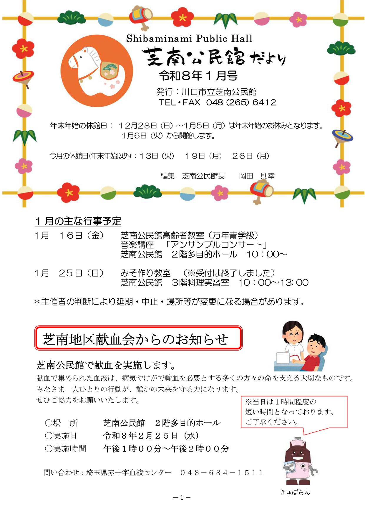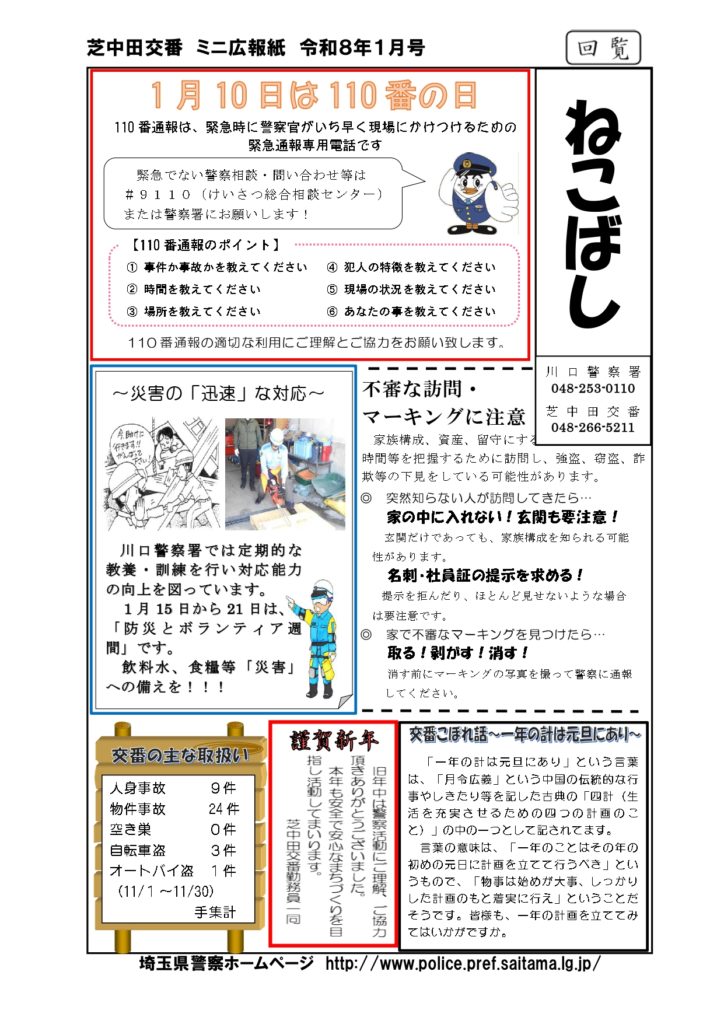 2026年1月9日 / 最終更新日時 : 2026年1月9日 shibanakada1-2 電子回覧板 2026年1月・電子回覧板 町内回覧板て次に回さないとゆっくり読む事が出来ませんがホームページ上にアップする事でいつでも読む事が出来ますね。 今後共 電子回覧板をご利用頂ければ幸いです。 目次 芝南小だより 1月号 櫻雲(芝中だより) 1月号 芝南公民館だより 1月号 ねこばし(芝中田交番 ミニ広報紙)1月号