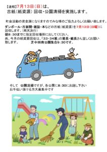 【速報】7月13日(日)は、 古紙(紙資源) 回収・公園清掃を実施します。