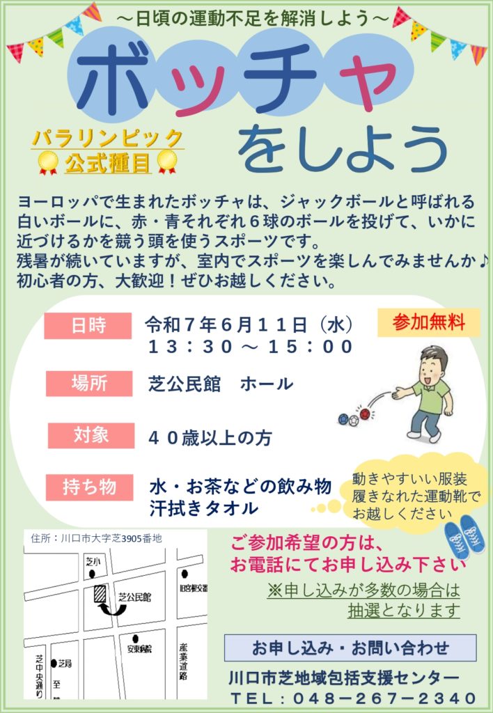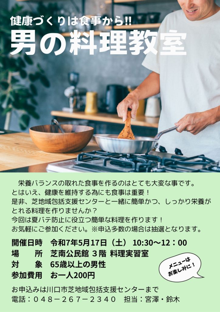 2025年5月7日 / 最終更新日時 : 2025年5月7日 shibanakada1-2 お知らせ 川口市芝地区包括支援センターからのお知らせ 目次 1.男の料理教室 開催日時 令和7年5月17日(土) 10:30~12:00 場 所 芝南公民館 3階 料理実習室 対 象 65歳以上の男性 参加費用 お一人200円 2.ボッチャをしよう 開催日時 令和7年6月11日(水) 13:30~15:00 場 所 芝公民館 ホール 対 象 40歳以上の方 持 ち 物 水・お茶などの飲み物、汗拭きタオル