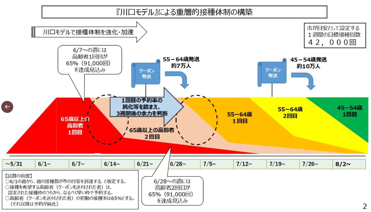 各地域(5か所)の集団接種会場を6月13日(日曜)までとし、旧川口そごう1階を一カ所集中大接種会場にします。また、6月1日より大規模病院の予約が始まる予定です。