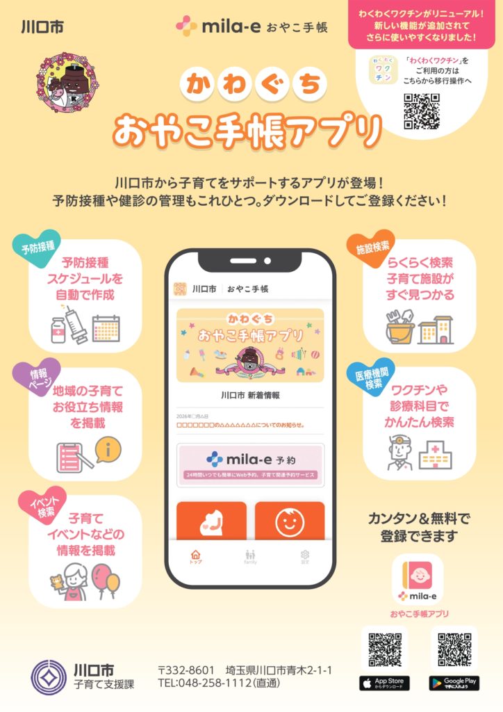 川口市では、子育て世代の皆さまをサポートするための新しいアプリ「かわぐちおやこ手帳アプリ」を4月1日より始めました。日々の子育てに役立つ情報や便利な機能を、スマートフォンやウェブサイト上で簡単にご利用いただけます。