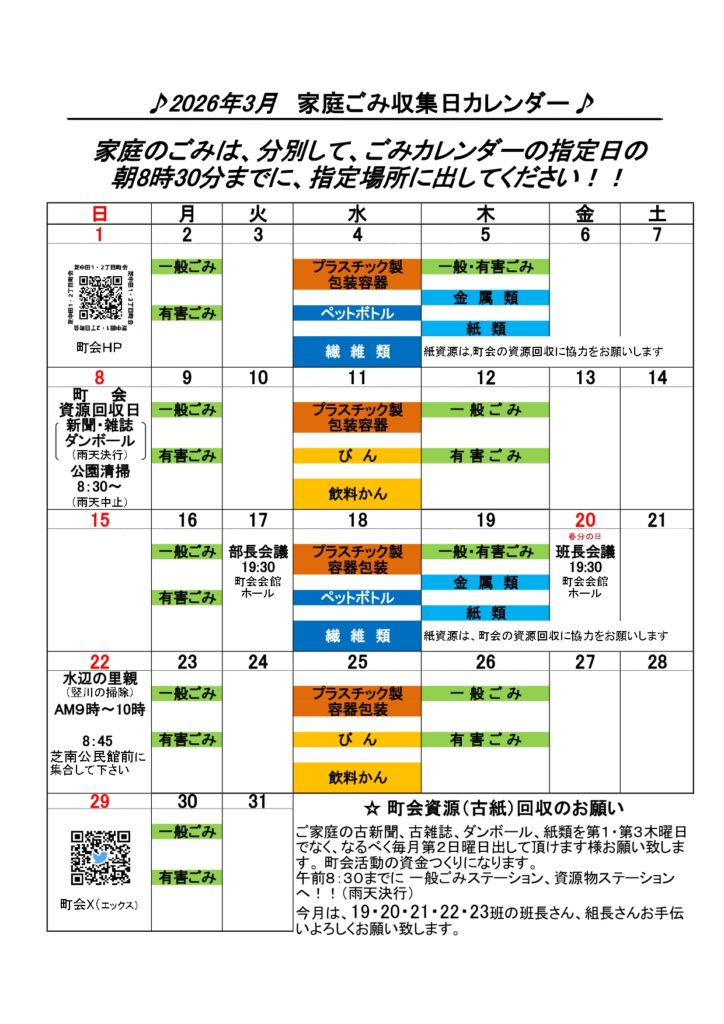 2026年3月 家庭ごみ収集カレンダー