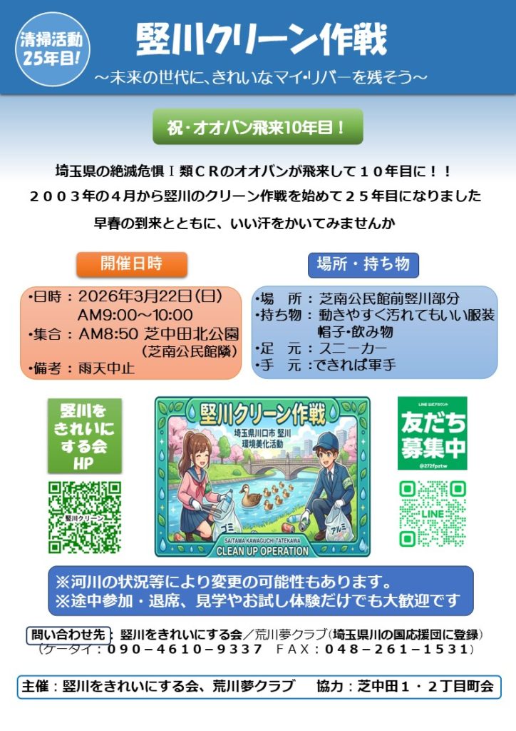 2026年3月22日(日)竪川の清掃を実施します。