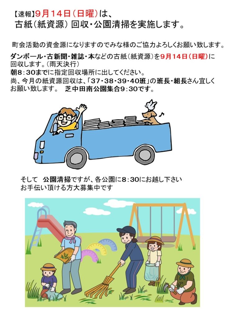 【速報】9月14日(日)は、 古紙(紙資源) 回収・公園清掃を実施します。