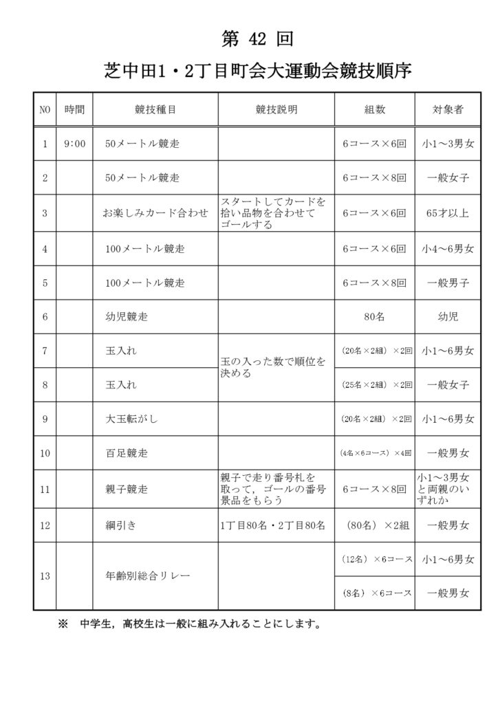 2025年9月3日 / 最終更新日時 : 2025年9月28日 shibanakada1-2 お知らせ 第42回芝中田1・2丁目町会大運動会のお知らせ 【芝中田1/2丁目町会大運動会】 開催日時 令和7年9月28日(日)8:30~13:00 会 場 芝南小学校 グランド 参 加 者 町会在住者または勤務者 持 ち 物 運動しやすい服装、履きなれた運動靴、飲み物、汗拭きタオル 【競技スケジュール】 【会場レイアウト】